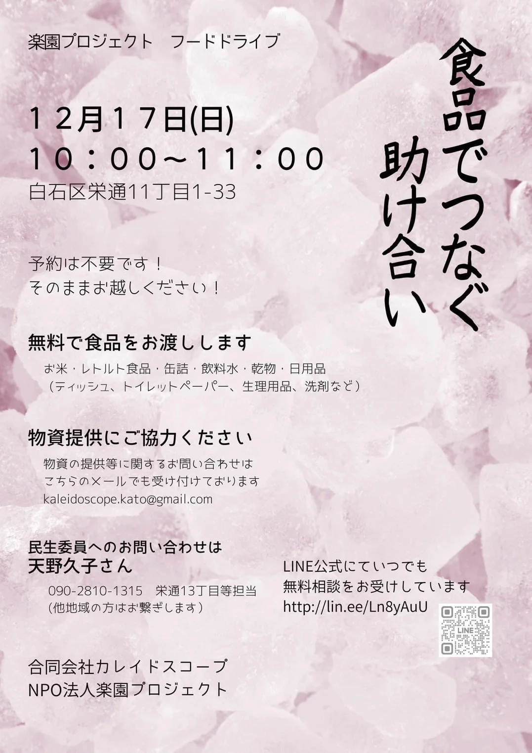 2021年3月コロナ禍で生活に困窮する方からの相談が相次ぎ、フードドライブを開催。その後毎月第3日曜日10:00〜11:00に開催して来ました。毎回多くのボランティアさんと多くの物資のご寄付を頂き配布しています。